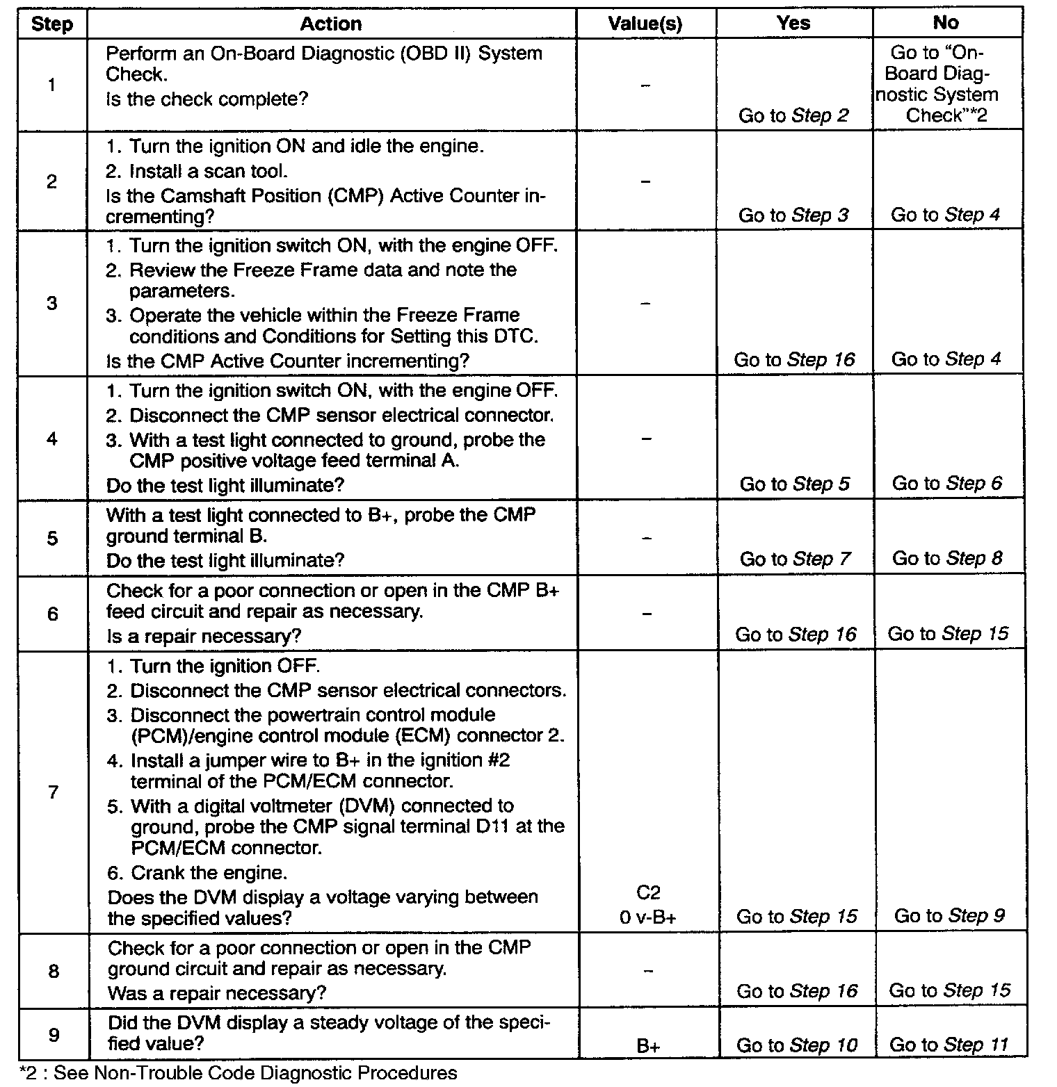 7. This step checks for a signal from the CMP. It is necessary to supply B+ to the ignition feed #2 terminal in order for the CMP to have B+ supplied to it. While cranking the engine, the CMP will send a B+ signal and then a ground signal as the reluctor passes the sensor.