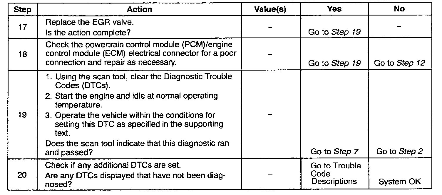 17. All circuits to the EGR valve are OK at this point. The fault lies internally in the EGR valve and, therefore, must be replaced. Be sure all gasket material is removed from the EGR mounting surface. Even a small amount of material may cause a DTC P0401 to set.