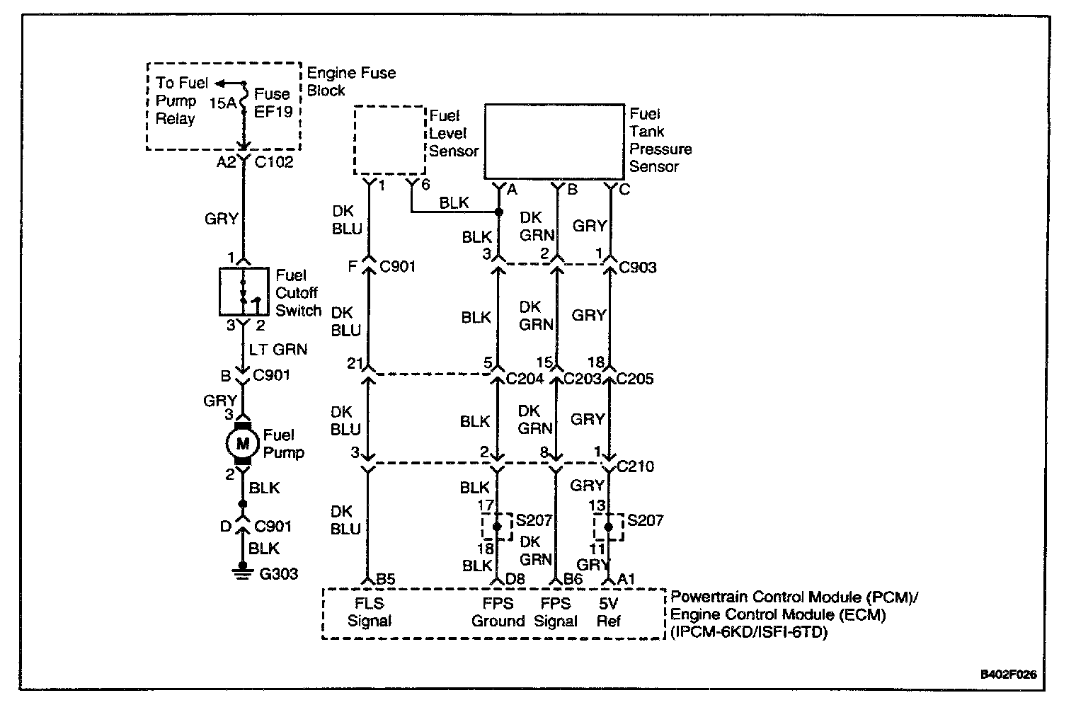 The PCM/ECM supplies a 5 v reference signal and a ground to the Fuel Tank Pressure sensor. The fuel tank pressure sensor sends a voltage signal back to the PCM/ECM relative to the fuel tank pressure. The voltage signal will vary from 0.2 v to 4.8 v.