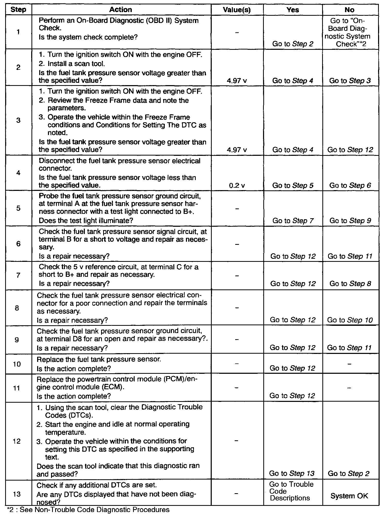 The PCM/ECM supplies a 5 v reference signal and a ground to the Fuel Tank Pressure sensor. The fuel tank pressure sensor sends a voltage signal back to the PCM/ECM relative to the fuel tank pressure. The voltage signal will vary from 0.2 v to 4.8 v.