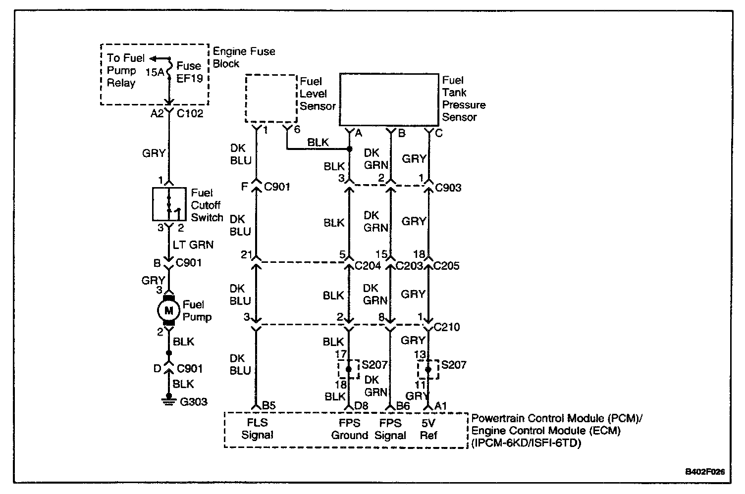 The powertrain control module (PCM)/engine control module (ECM) uses the fuel level input from the Fuel Level Sensor to calculate expected vapor pressures within the fuel system. Vapor pressures vary as the fuel level changes. Vapor pressure is critical in determining if the Evaporative (EVAP) Emission system is operating properly. Fuel level is also used to determine it the fuel level is too high or too low to be able to accurately detect EVAP emission system faults. This Diagnostic Trouble Code (DTC) detects a continuous short to high in either the signal circuit of the fuel level sender.