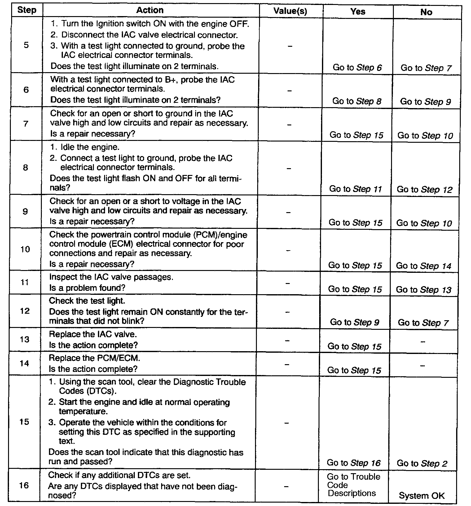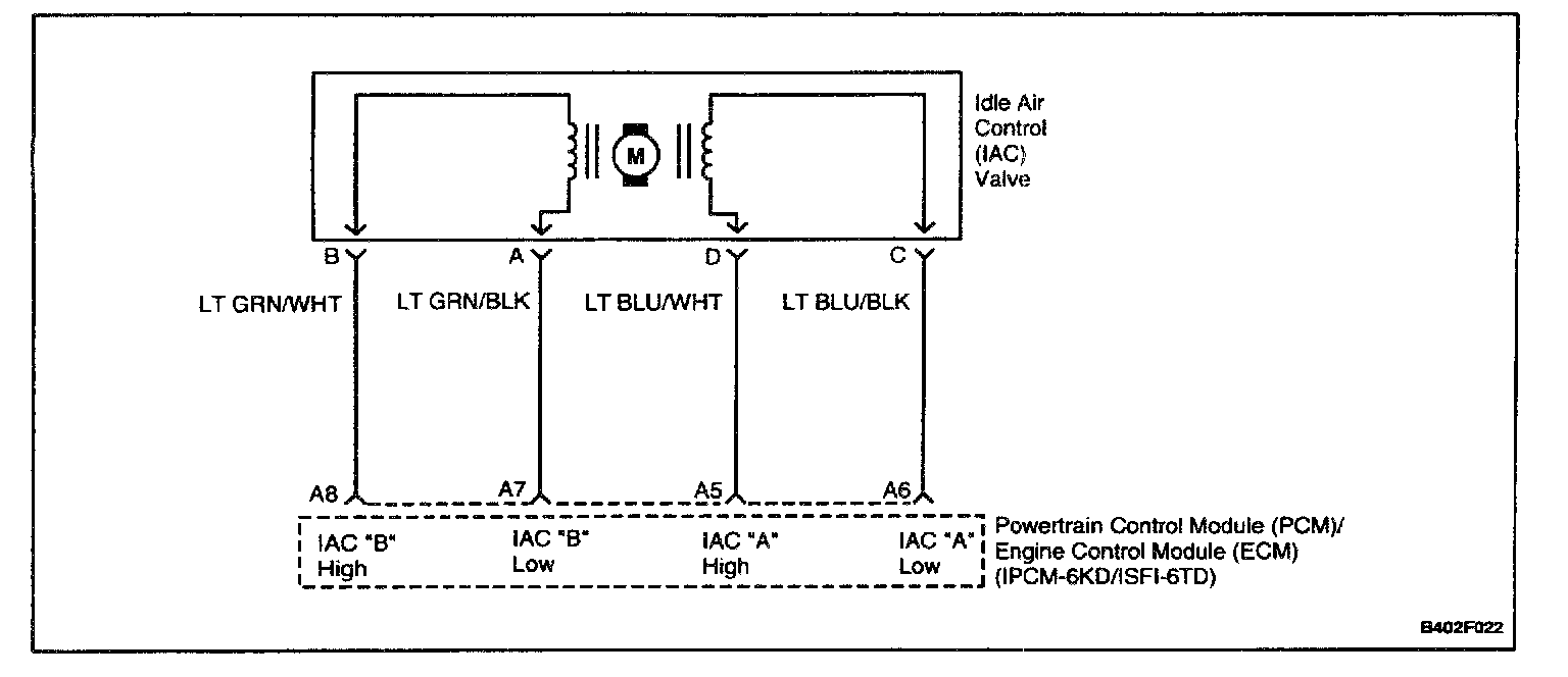 6. The IAC circuits always have ground or voltage signals on them in pairs. If the test light illuminates on more or less than 2 terminals, 1 of the circuits is shorted to ground or open.