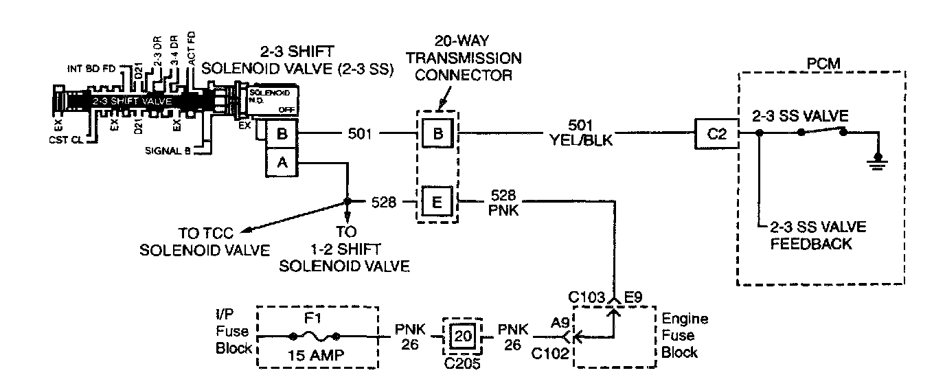 The 2-3 Shift Solenoid Valve (2-3 SS Valve) is a normally open valve that is used in conjunction with the 1-2 Shift Solenoid Valve (1-2 SS Valve) to allow four different shifting combinations (Refer to Shift Solenoid Chart). The 2-3 SS Valve blocks 2-3 signal fluid from exhausting. 2-3 Signal fluid is routed to both the 1-2 and 2-3 shift valves. The solenoid is attached to the valve body within the transmission. Voltage is supplied directly to the solenoid through the Powertrain Control Module (PCM). The PCM commands the solenoid ON or OFF by providing a ground path through circuit 501.