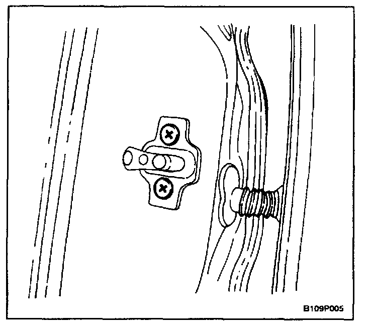 The door lock striker consists of a striker with two screws that are threaded into a tapped, floating cage plate located in the appropriate body pillar. The floating cage plate allows the striker to be easily adjusted in or out and up or down. The door is secured in the closed position when the door lock fork snaps over and engages the striker.NOTE: The door lock striker is an important attaching part that can affect the performance of vital components and systems and can cause major repair expenses. If replacement becomes necessary, the door lock striker must be replaced by one with the same part number or equivalent. Do not use a replacement part of lesser quality or of a substitute design. The specified torque values must be used during reassembly in order to ensure proper retention of the part.