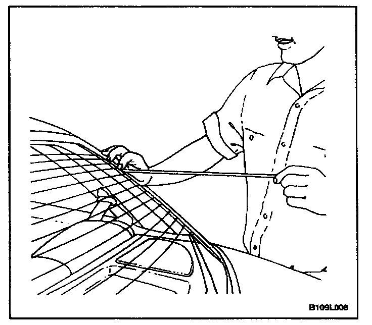 5. Using the glass sealant remover J-24402, cut the adhesive around the rear window.