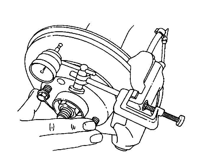 5. Set the gauge probe tip to approximately 10 mm (0.39 inch) from the outer edge of the brake rotor, perpendicular to the disc and under slight preload. Rotate the rotor while observing the gauge.