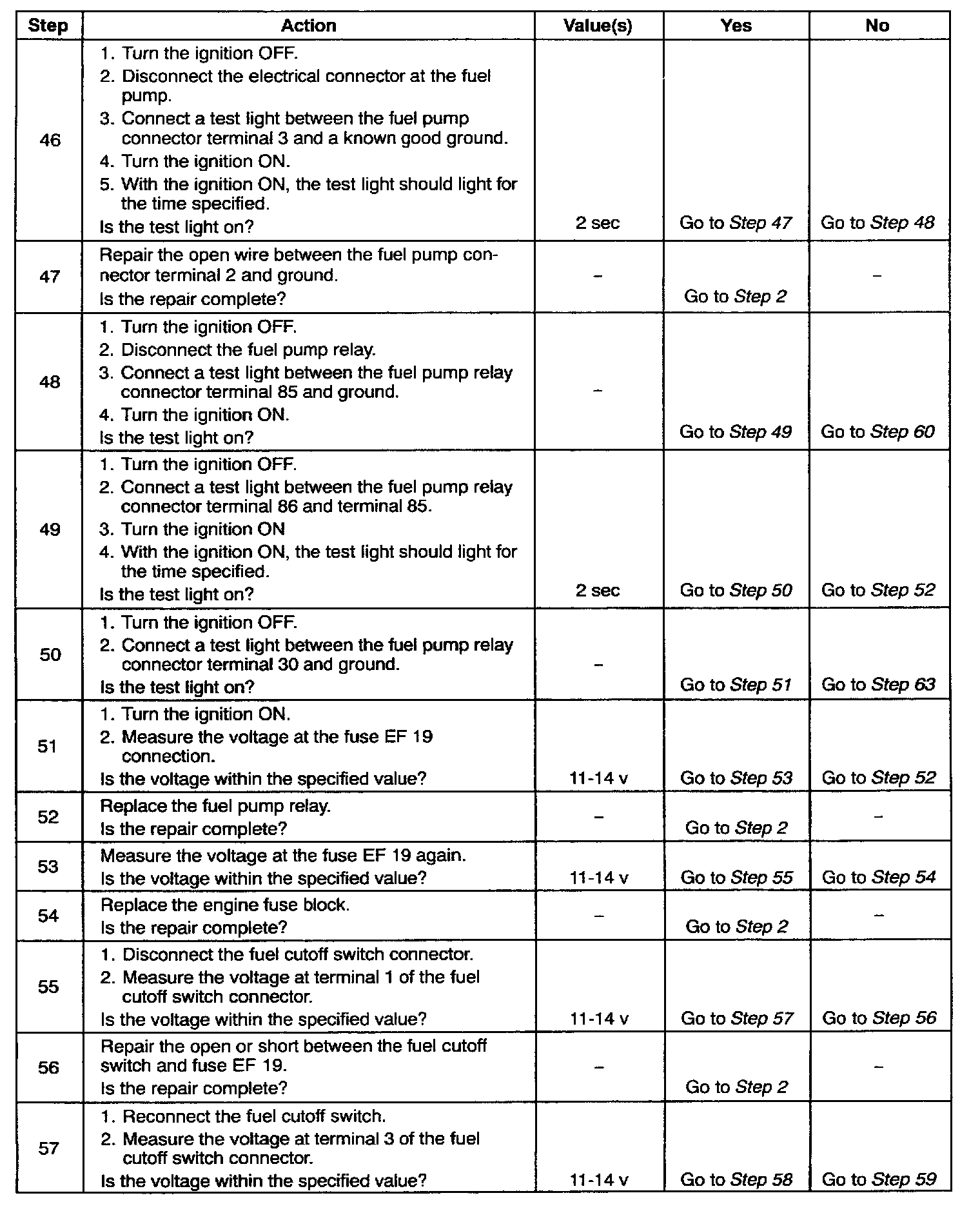 59. This step checks for a ground signal being supplied by the PCM/ECM to operate the fuel injectors. If there is no ground present during the cranking of the engine, and the fuel injector wiring is OK, the PCM/ECM is at fault.