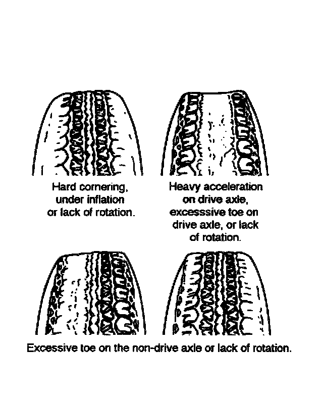 TIRE DIAGNOSISIrregular and Premature Wear Irregular and premature tire wear has many causes. Some of them are incorrect inflation pressures, lack of regular rotation, poor driving habits, or improper wheel alignment. If the wheel alignment is reset because of tire wear, always reset the toe as close to zero degrees as the specification allows.