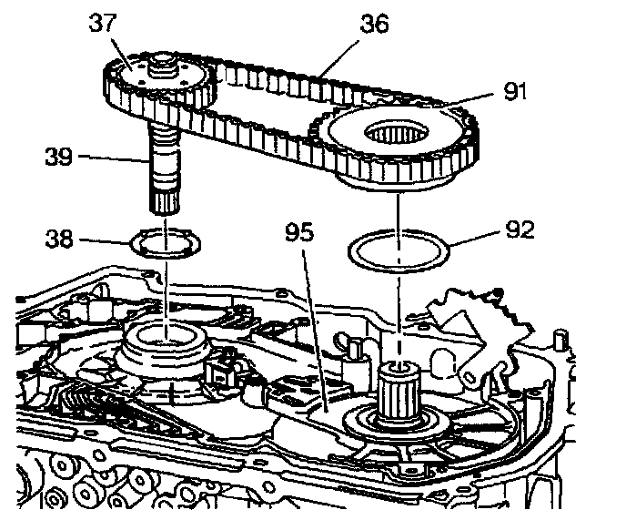 2. If the drive sprocket to drive sprocket support thrust washer (38) has not remained with the drive sprocket assembly (37 and 39), remove the drive sprocket to drive sprocket support thrust washer (38). The driven sprocket to driven sprocket support thrust washer (92) should remain with the driven sprocket support assembly (95).