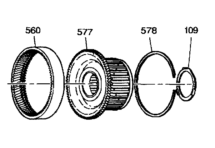 1. Assemble the forward clutch hub (577) onto the input internal gear (560) and retain it with the snap ring (578).