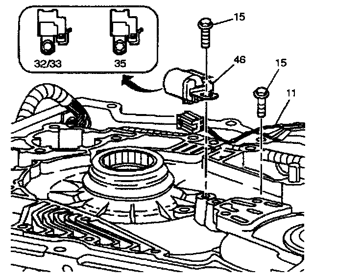 INPUT SPEED SENSOR INSTALLImportant: The tab on the sensor housing (46) fits into the recess on the case boss. For drive sprockets with 35 teeth, use a black sensor housing. For drive sprockets with 32 or 33 teeth, use a natural colored sensor housing.