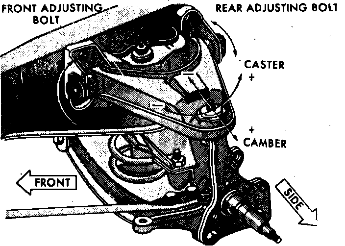 Caster may be adjusted by inserting a wedge between the spring and axle. To increase caster insert wedge so that the thick part faces rear of vehicle. To decrease caster insert wedge so that the thick end is toward front of vehicle.
