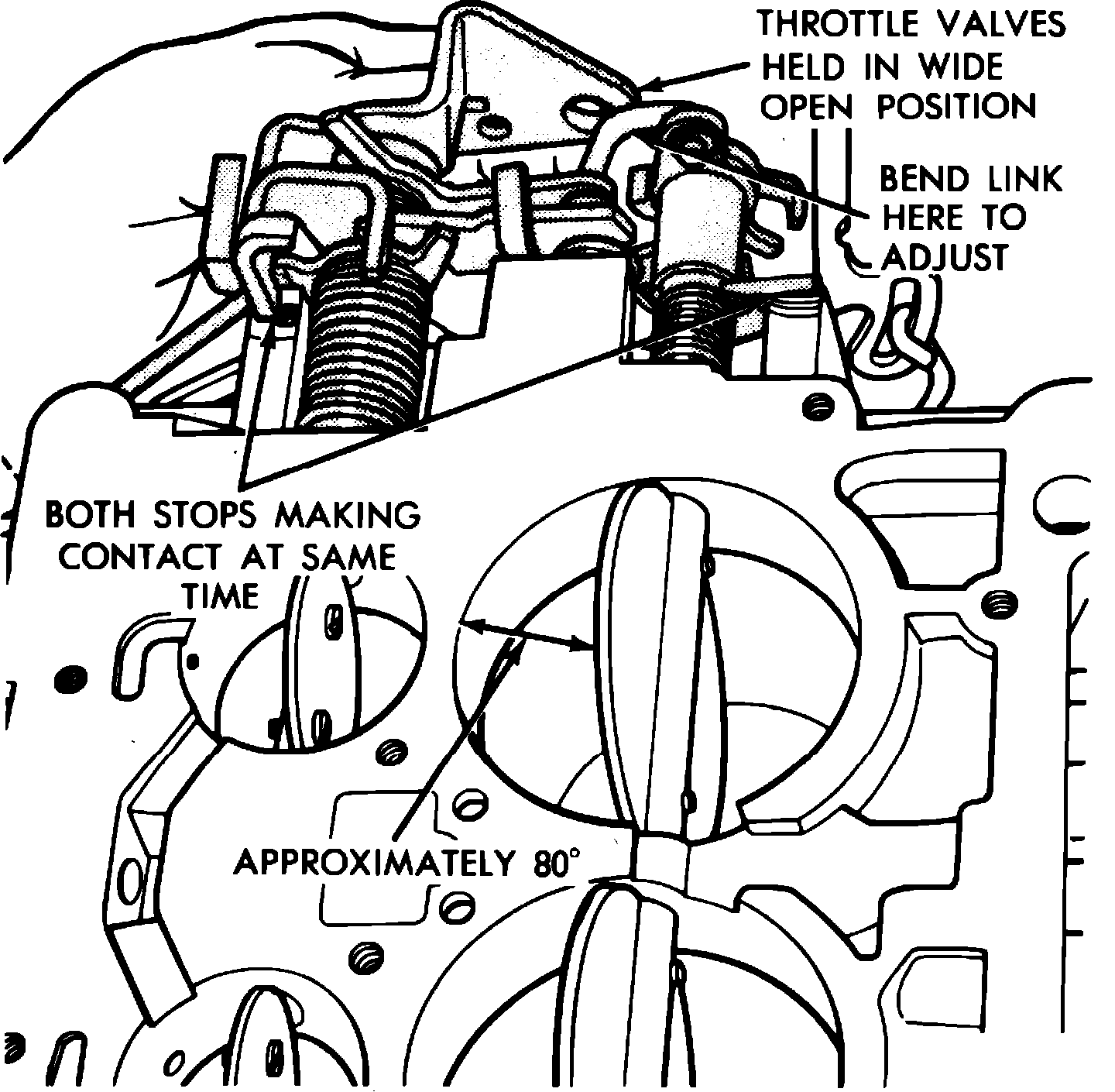 Block choke valve in wide open position and invert carburetor, Fig. 4. Slowly open the primary throttle valves until it is possible to measure between lower edge of primary valve and its bore. When dimension is as shown in the specifications chart, the secondary valves should just start to open. If necessary to adjust, bend rod until correct dimension is obtained.