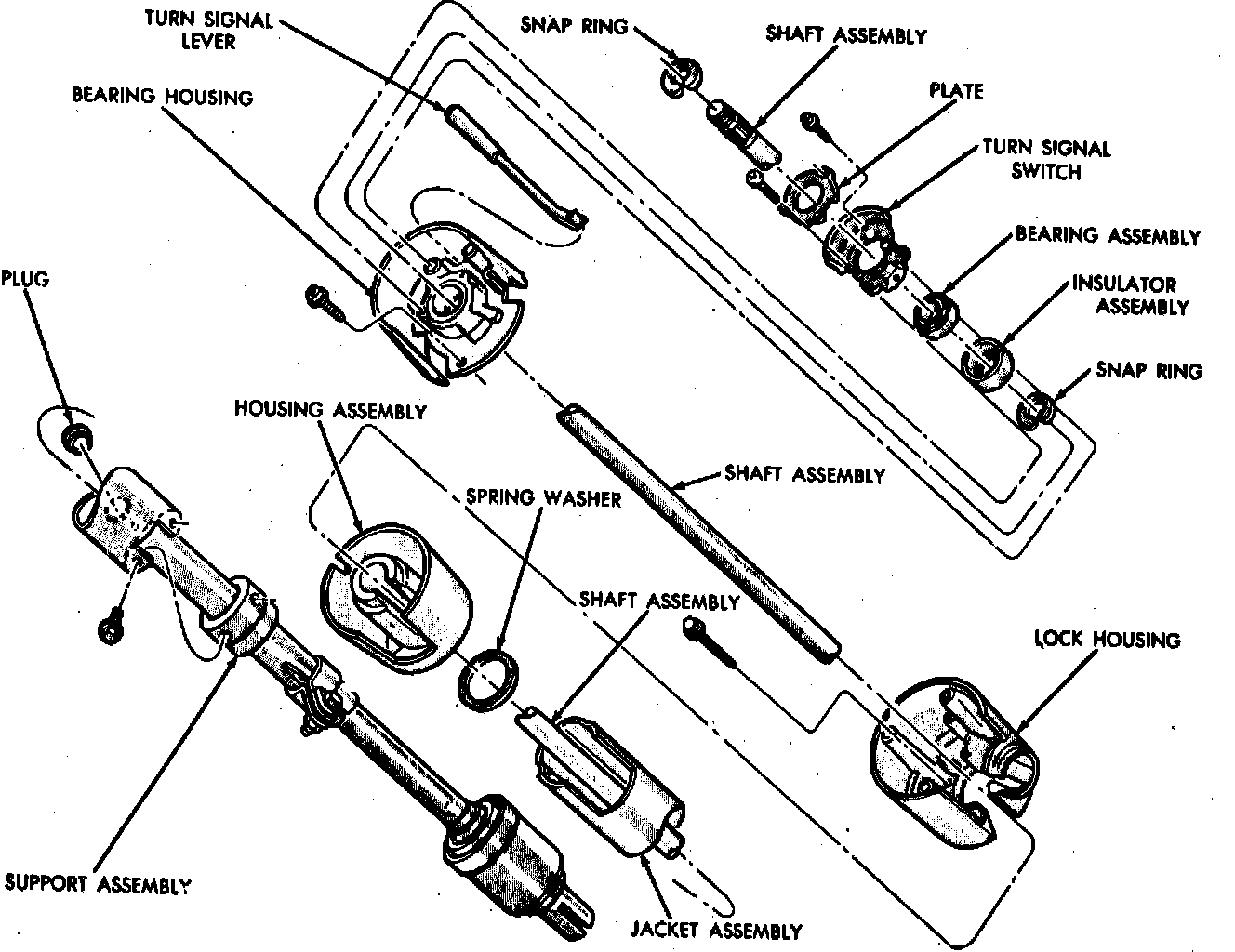 10. Install bearing support (floor shift), bearing and spring on steering shaft and insert the steering shaft assembly into the column.
