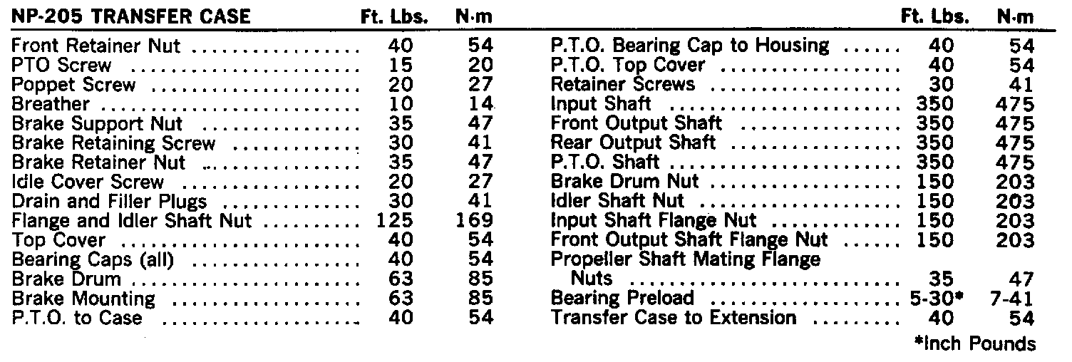 NP-205 Torque Specifications: