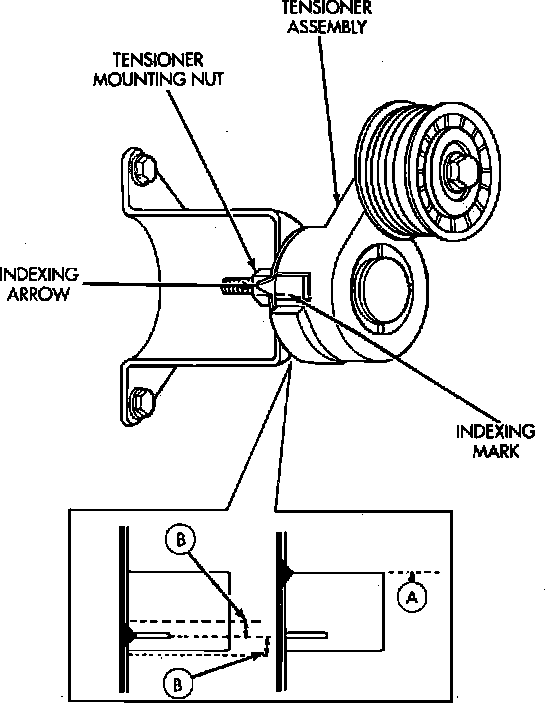 The automatic tensioner is equipped with an indexing arrow on the back of the tensioner housing. If a new belt is being installed, the arrow must be within approximately 1/8 inch of the point B indexing mark. If an old belt is being used, it must not pass the point marked A, Fig. 40.