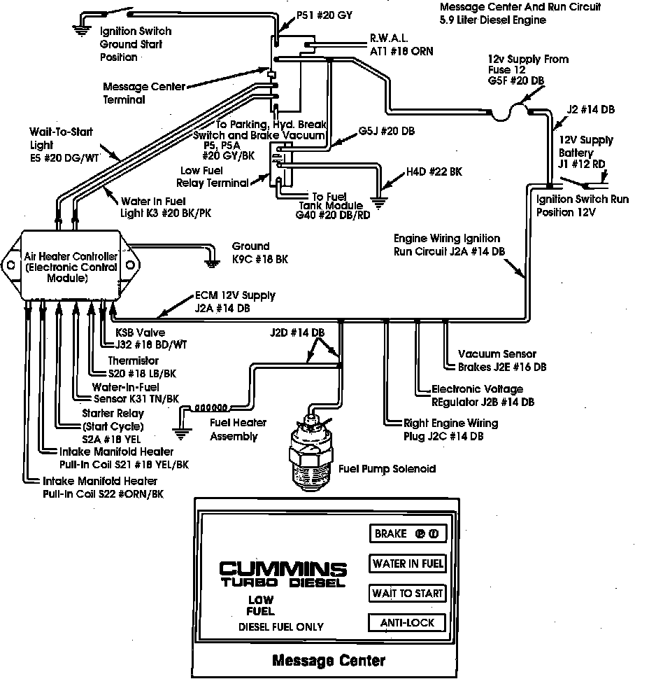 The engine has water temperature and oil pressure sensors connected to gauges on the instrument panel. In addition to the ammeter, water and oil gauges, a message center and run circuit is also used.