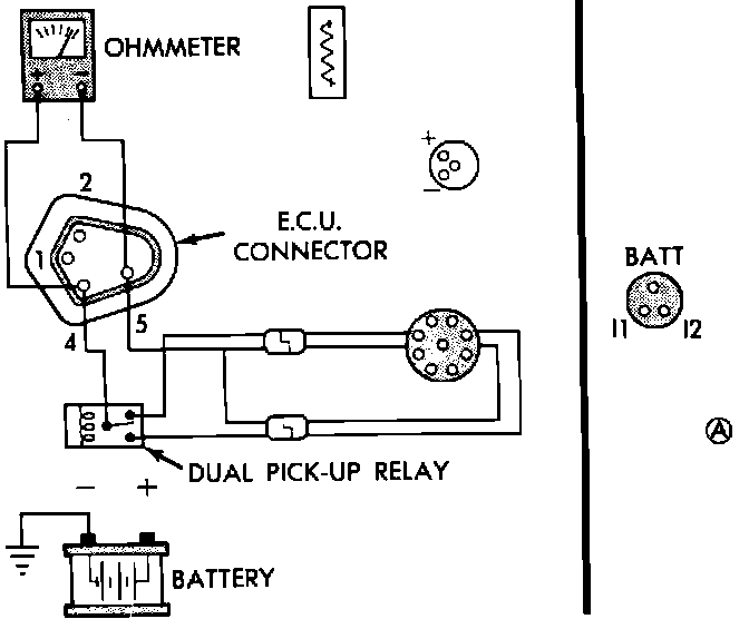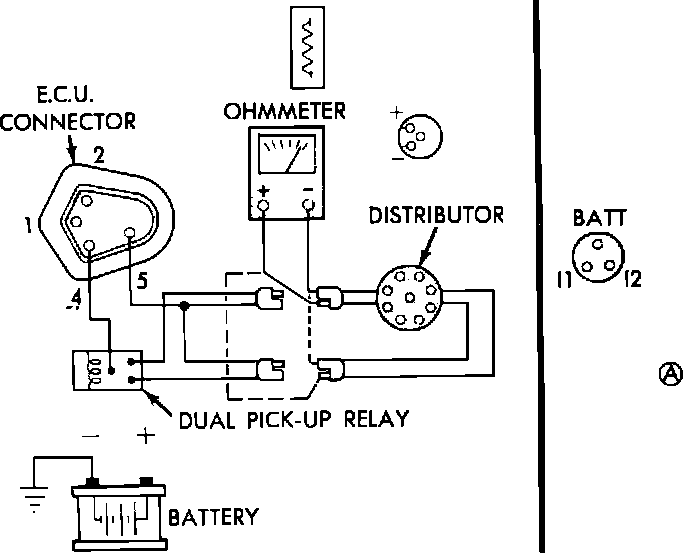 1. Turn ignition switch OFF and with an ohmmeter check resistance between cavities 4 and 5 of ECU harness connector. It should be between 150 and 900 ohms.
