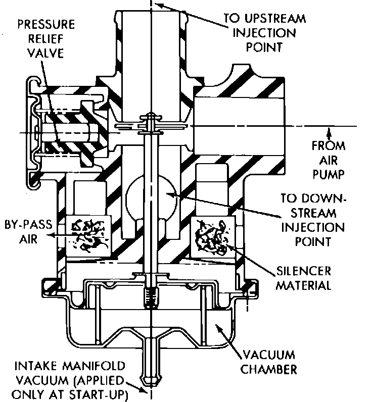 The diverter valve is located upstream of the switch/relief valve. It's purpose is to prevent backfire during deceleration. The diverter valve senses changes in manifold vacuum. When decelerating, vacuum increases rapidly. This increase causes the valve to open thus allowing air from the air pump to vent through the silencer and out to the atmosphere. When accelerating, vacuum drops rapidly. This decrease in vacuum causes the valve to shut allowing air to flow either upstream or downstream.