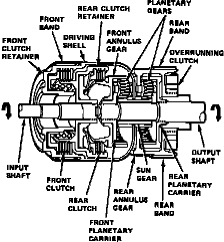 The common sun gear of the planetary gear sets is connected to the front clutch by a driving shell that is splined to the sun gear and to the front clutch retainer.