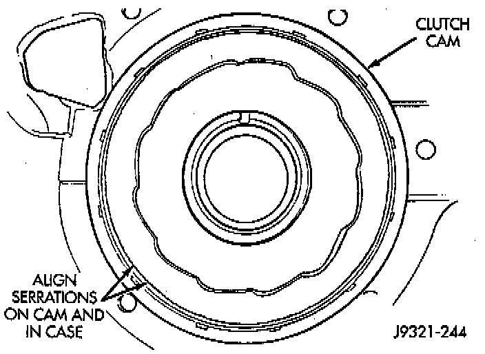 2. Align and start new clutch cam and spring retainer in case. Be sure serrations on cam and in case are aligned. Then tap cam into case just enough to hold it in place.