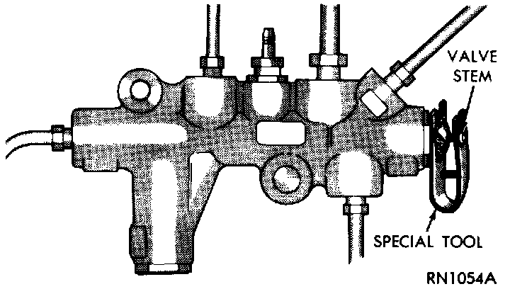 NOTE: All vehicles are equipped with a pressure hold-off valve. The valve is located (in the combination valve) on the left frame rail. The hold off valve balances front and rear braking force to improve braking and steering control on icy surfaces. The valve shuts off the flow of brake fluid between 3 and 135 PSI. Because the valve shuts off flow in this pressure range the valve must be held open manually -- using tool C-4121 or equivalent -- when pressure bleeding the system.