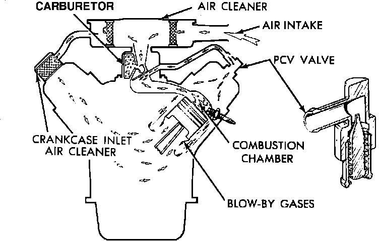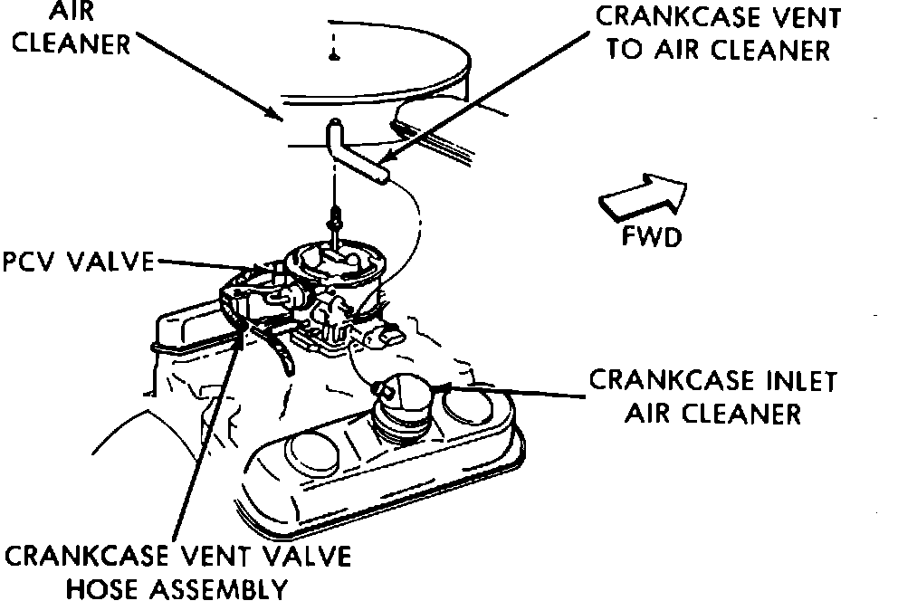 The PCV system operates on manifold vacuum: Fresh air is drawn in through the air cleaner and crankcase inlet filter, into the engine, and the vapors that come out through the PCV valve are blow-by gases. These gases are drawn through the PCV hose and into the carburetor, they mix with the calibrated air/fuel mixture, and get burned and expelled with the exhaust gases.
