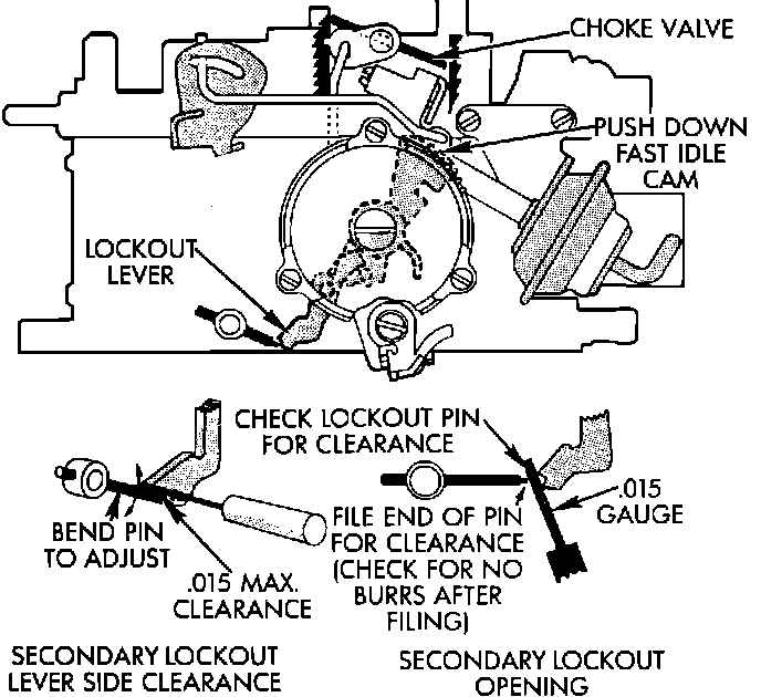 1. To set the secondary lockout lever adjustment, close the choke valve, and the throttle valve. Insert a .015 in. plug gauge as shown.