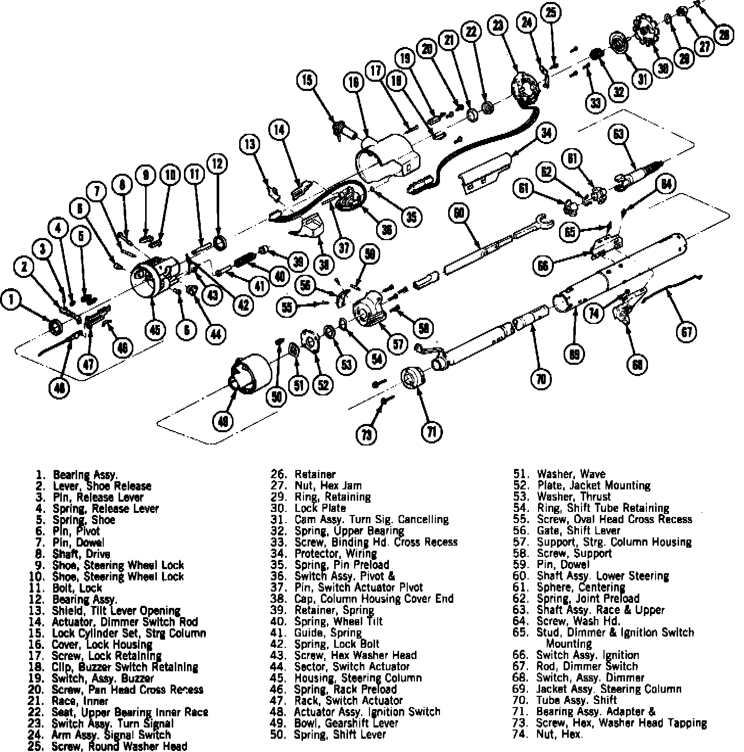Fig. 19 Tilt wheel steering column exploded view. Front wheel drive: