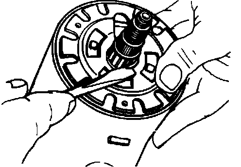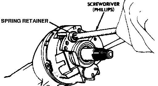 8. Carefully remove plastic cover from lock plate, then depress lock plate and pry retaining ring out of groove with a screwdriver. Tool No. C-4156 can be used to depress lock plate, however, it will make removal of retaining ring more difficult, since the full load of the retaining plate will not be applied, allowing the retaining ring to turn.