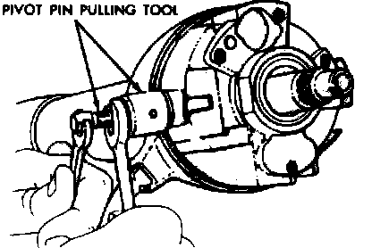 17. Place pivot pin remover tool No. C-4016 or equivalent over pivot pin and thread small portion of screw firmly into pin. While holding screw from turning, turn nut clockwise to remove pin from support. Remove opposite pin in same manner.