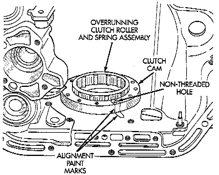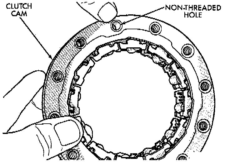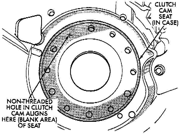 1. Examine bolt holes in overrunning clutch cam. Note that one hole is not threaded. This hole must align with blank area in clutch cam bolt circle.
