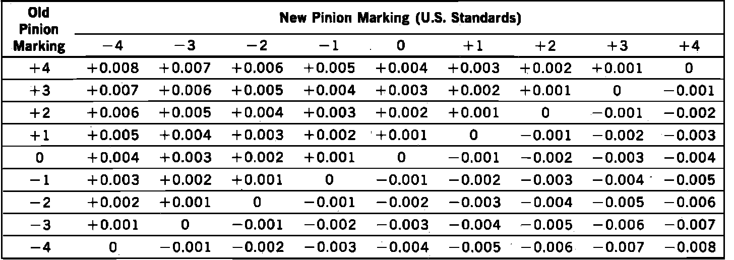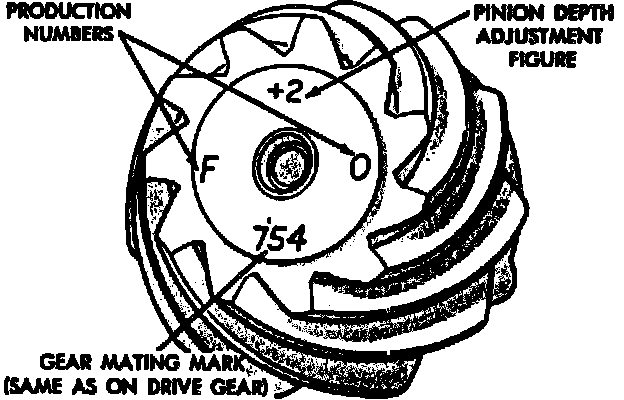 1. Inspect face of both new and old drive pinion for pinion depth modification code. To ensure proper contact of ring gear and pinion teeth, pinion may be marked with a plus (+) or minus ( - ) code number. This number indicates in thousandths of an inch necessary modifications of nominal pinion depth. It is essential that this code number be factored when selecting pinion depth adjusting shims.