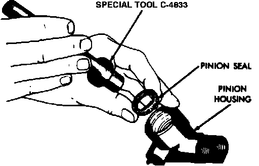 7. Install pinion shaft lower seal using tool No. C-4883. Then using a suitable socket, press in on race of bearing, using caution not to cock bearing.