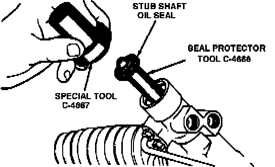10. Install stub shaft bearing then, position seal protector tool No. C-4668 or equivalent, slide shaft seal over protector into valve housing. Seat seal with seal installer No. C-4667 or equivalent and install retaining snap ring.
