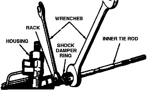 5. using a wrench to prevent rack from rotating, position a wrench on inner tie rod pivot housing flats. Turn housing counterclockwise until tie rod assembly separates from rack.