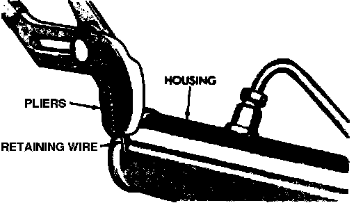 7. Using a punch, rotate the right side rack bulkhead retaining wire clockwise to expose end of retaining wire. Pull retaining wire out of cylinder slot.