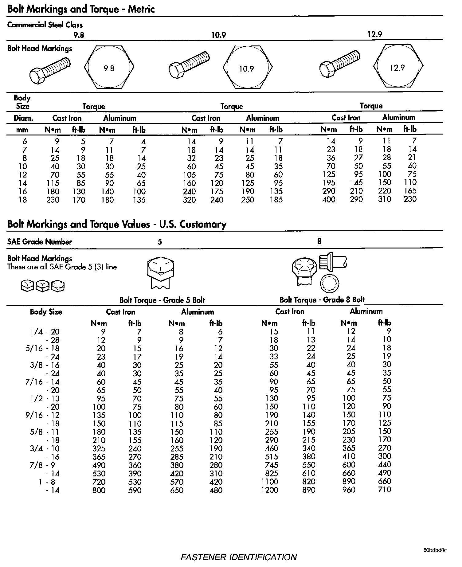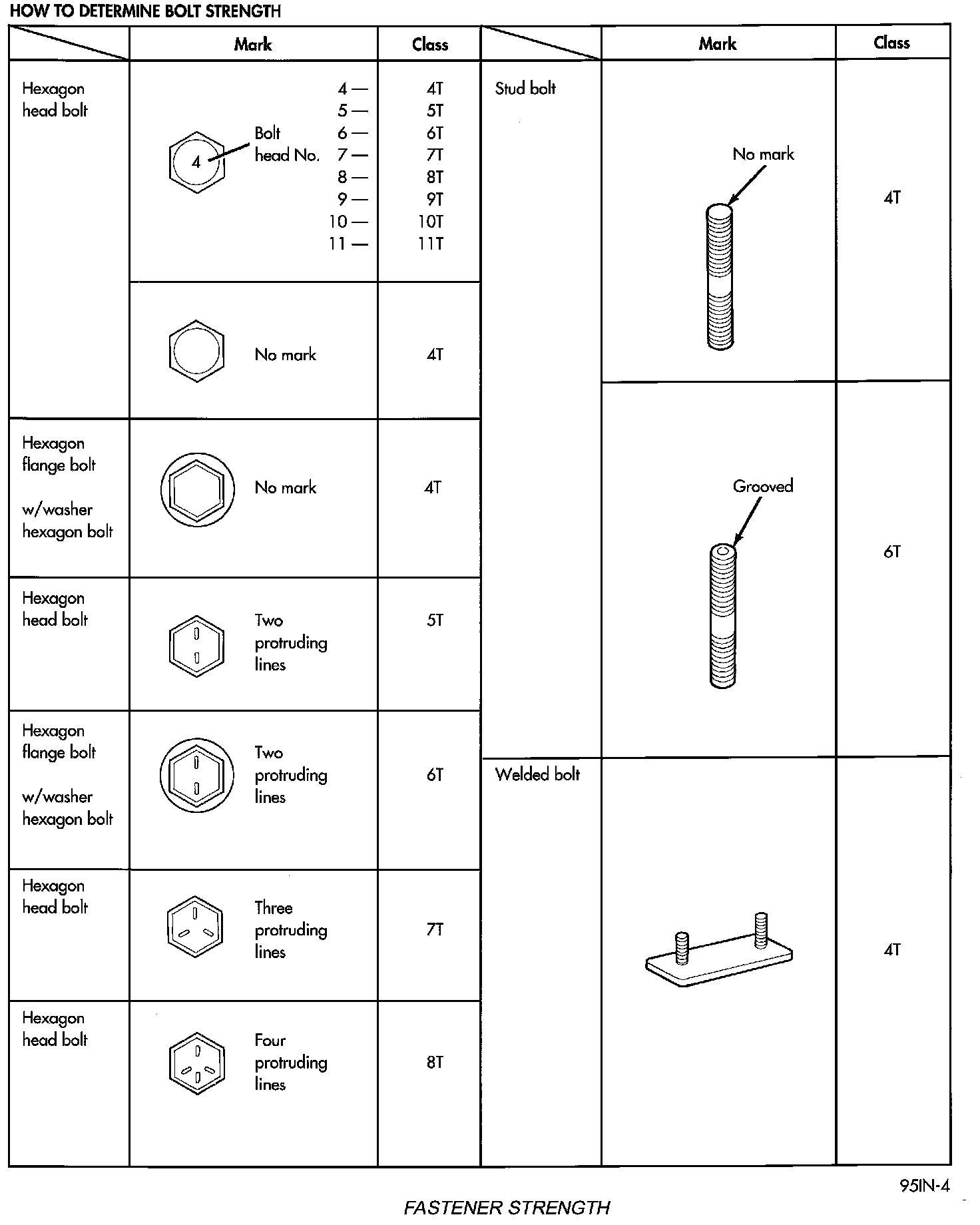 The SAE bolt strength grades range from grade 2 to grade 8. The higher the grade number, the greater the bolt strength. Identification is determined by the line marks on the top of each bolt head. The actual bolt strength grade corresponds to the number of line marks plus 2. The most commonly used metric bolt strength classes are 9.8 and 10.9. The metric strength class identification number is imprinted on the head of the bolt. The higher the class number, the greater the bolt strength. Some metric nuts are imprinted with a single-digit strength class on the nut face. Refer to the Fastener Identification and Fastener Strength Charts.