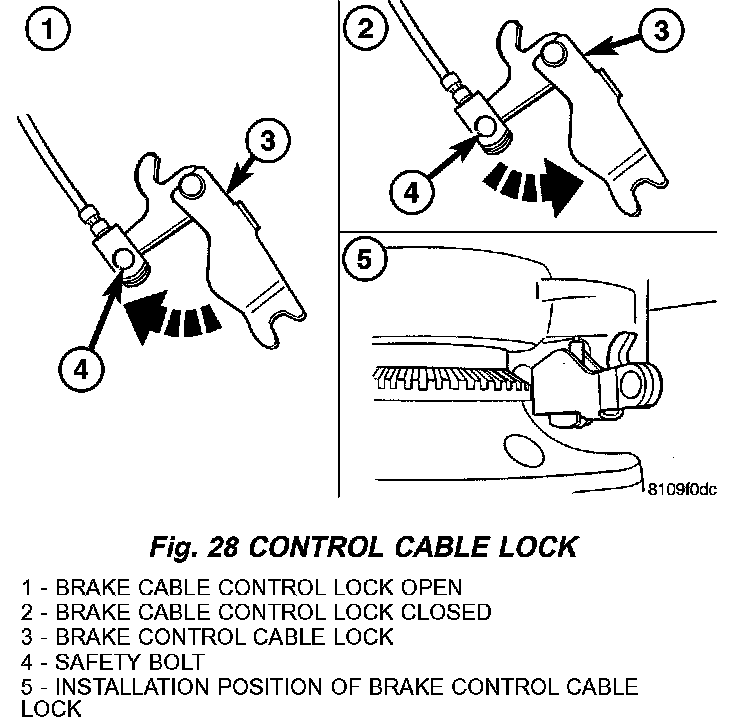 2. Insert the safety bolt and snap shut the brake control cable lock. Observe the installation position of the brake control cable lock (Fig. 28).