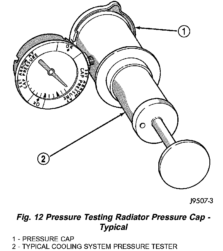 Operate the tester pump and observe the gauge pointer at its highest point. The cap release pressure should be 124 - 145 kPa (18 - 21 psi). The cap is satisfactory when the pressure holds steady. It is also good if it holds pressure within the 124 - 145 kPa (18 - 21 psi) range for 30 seconds or more. If the pointer drops quickly, replace the cap.