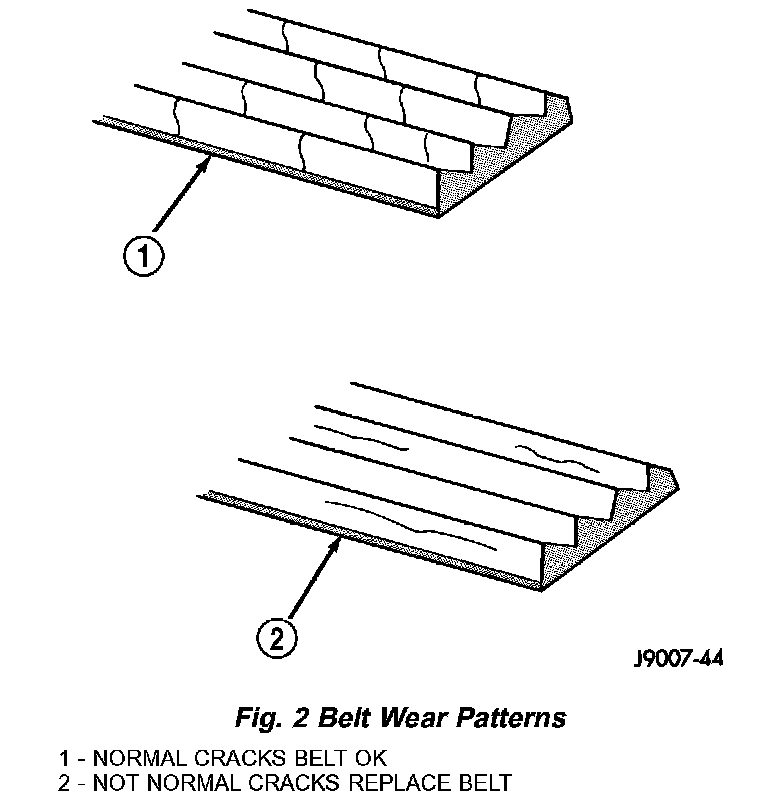 When diagnosing serpentine accessory drive belts, small cracks that run across the ribbed surface of the belt from rib to rib (Fig. 2), are considered normal. These are not a reason to replace the belt. However, cracks running along a rib (not across) are not normal. Any belt with cracks running along a rib must be replaced (Fig. 2). Also replace the belt if it has excessive wear, frayed cords or severe glazing.
