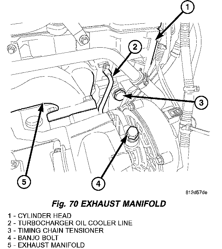 12. Remove the turbocharger to exhaust manifold fasteners and remove turbocharger (Fig. 70).