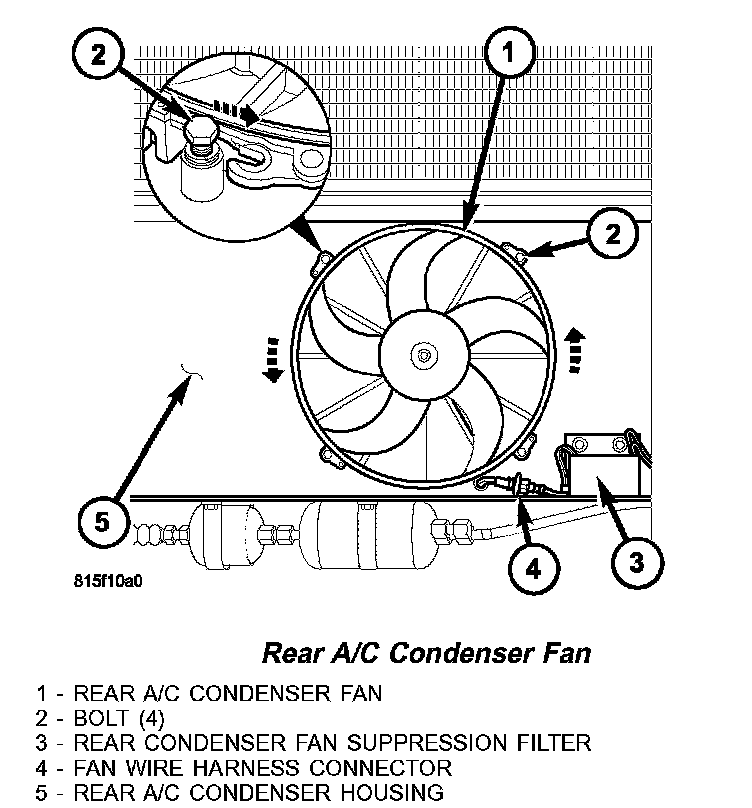 4. Loosen the four bolts that secure the rear A/C condenser fan to the top of the rear A/C condenser housing.