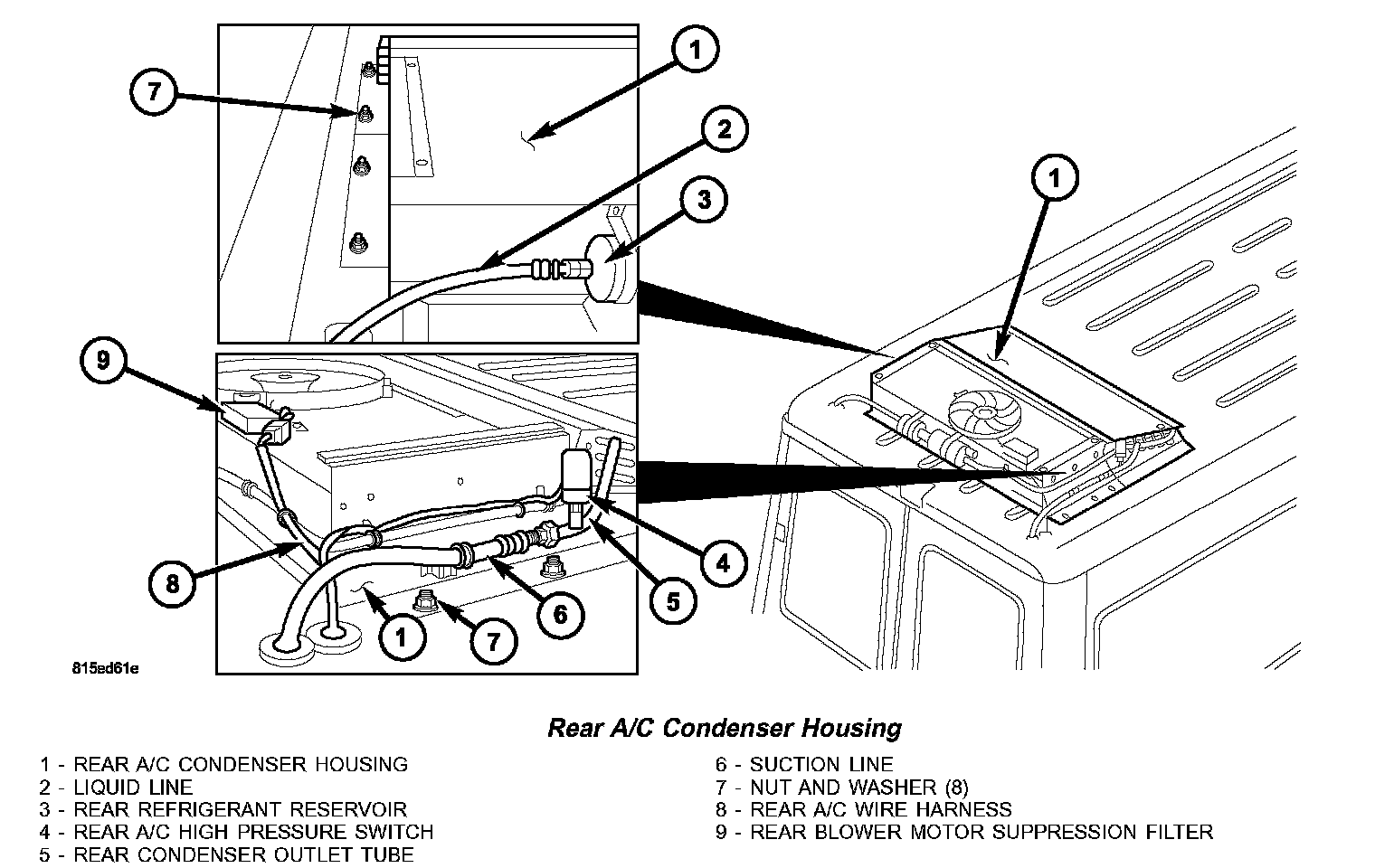 NOTE: Be certain to add refrigerant oil if the rear A/C condenser is being replaced. The refrigerant oil must be drained from the old condenser and measured to determine the amount of refrigerant oil to add to the new condenser. Use only refrigerant oil of the type recommended for the rear A/C compressor in the vehicle.