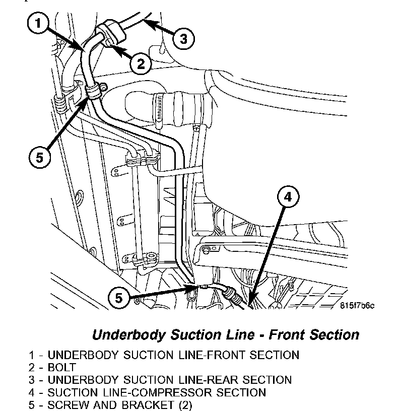 NOTE: The underbody refrigerant lines for the optional rear A/C system are serviced in five sections. Two sections are connected the A/C compressor. Two sections of the underbody suction line (low-side) are connected together by a tapping block with an O-ring seal. The underbody A/C discharge line uses a spring-lock type refrigerant line coupler with an O-ring seal.