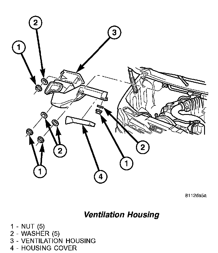 10. Remove the nuts and washers that secure the ventilation housing to the body and remove the ventilation housing from the vehicle.