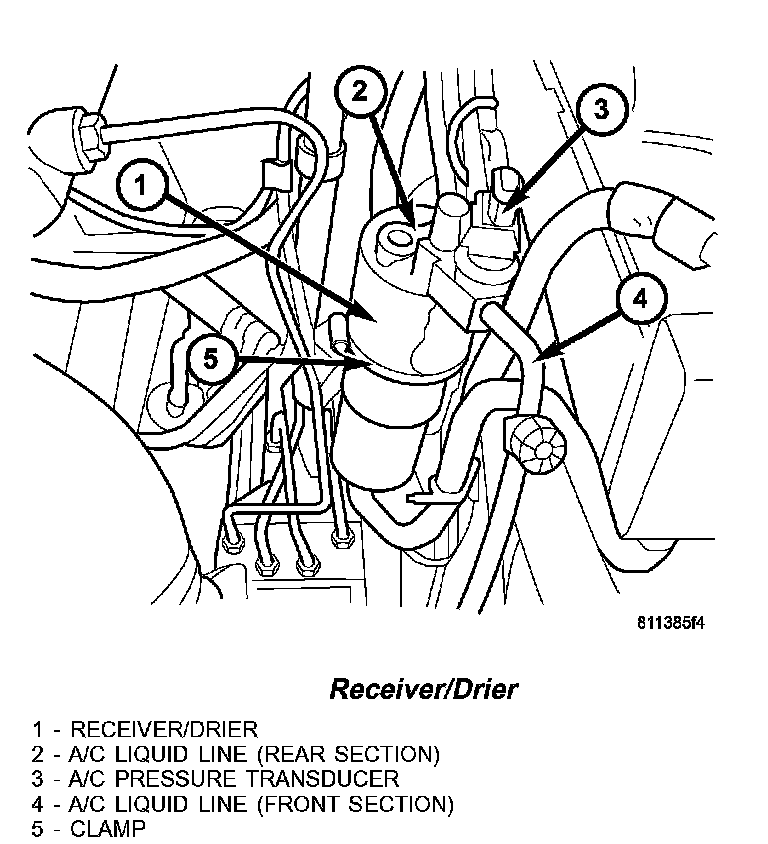 NOTE: If the receiver/drier is being replaced, add 30 milliliters (1 fluid ounce) of refrigerant oil to the refrigerant system. Use only refrigerant oil of the type recommended for the A/C compressor in the vehicle.