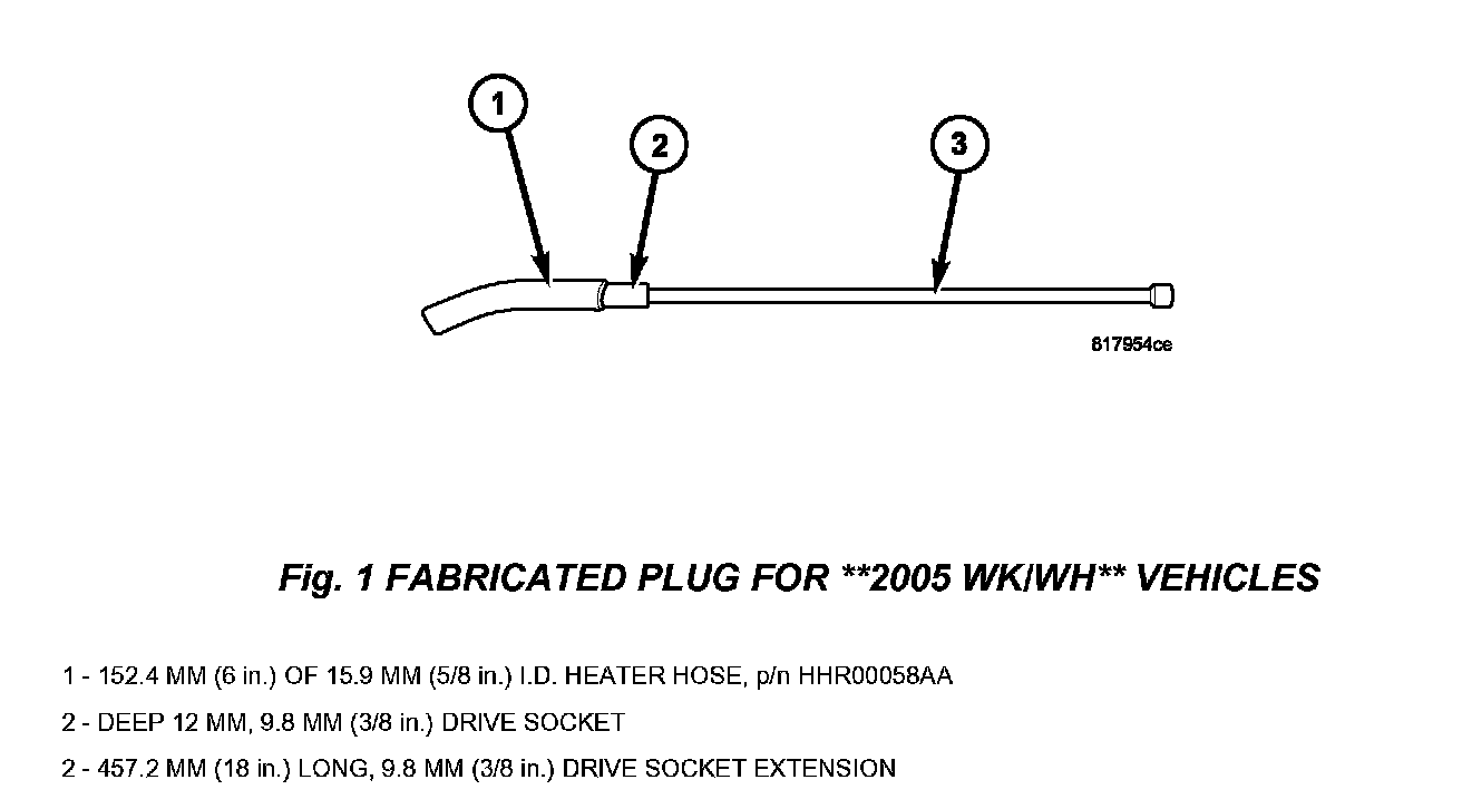 4. On **2005 WK/WH** vehicles (other vehicles proceed to next step), fabricate the cooling coil drain plug as follows (Fig. 1):