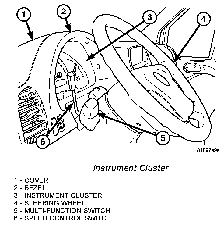 The instrument cluster for this model is an Electro Mechanical Instrument Cluster (EMIC) that is located above the steering column opening in the instrument panel, directly in front of the driver. The remainder of the EMIC, including the mounts and the electrical connections, are concealed within the instrument panel behind the cluster bezel and beneath the instrument panel top cover for the cluster. The instrument cluster includes analog gauges, meters, indicators, and acoustic signal transmitters.