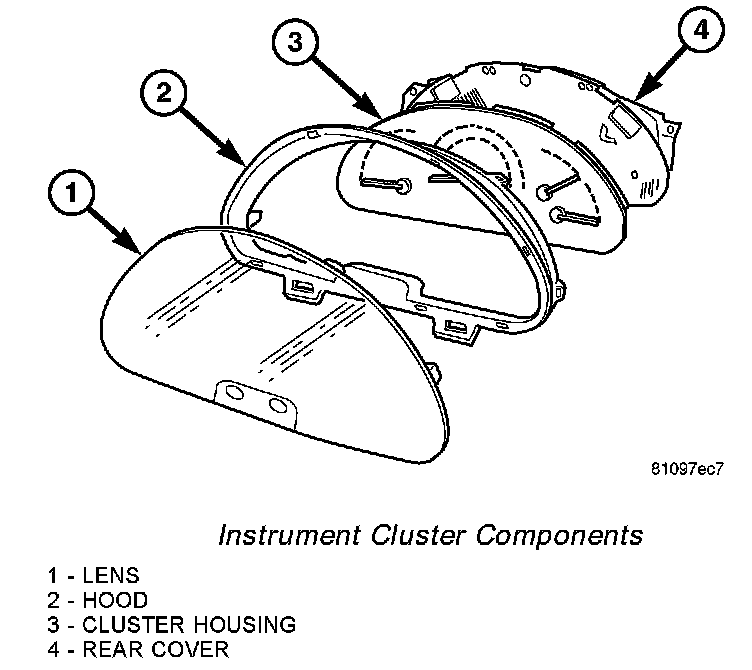 The rear of the cluster housing and the EMIC electronic circuitry are protected by the molded plastic rear cover. A mounting ear at each upper corner of the rear cover are used to secure the EMIC to the molded plastic instrument panel base unit with two screws. The rear cover includes clearance holes for the two cluster connector receptacles on the cluster electronic circuit board. The connector receptacles on the back of the cluster electronic circuit board connect the EMIC to the vehicle electrical system through two take outs with connectors from the vehicle wire harness. The EMIC rear cover includes a molded mounting tab and a latch feature that secures the RKE/immobilizer module to the back of the cluster. The RKE/immobilizer module is connected to the vehicle electrical system through a separate take out and connector of the vehicle wire harness.
